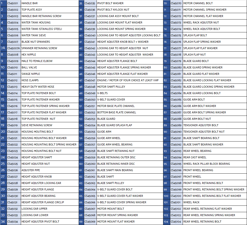 Please note that our parts are locally manufactured and should fit most of the small plant equipment supplied by Concrete Works and most of the major leading retailers across Southern Africa.