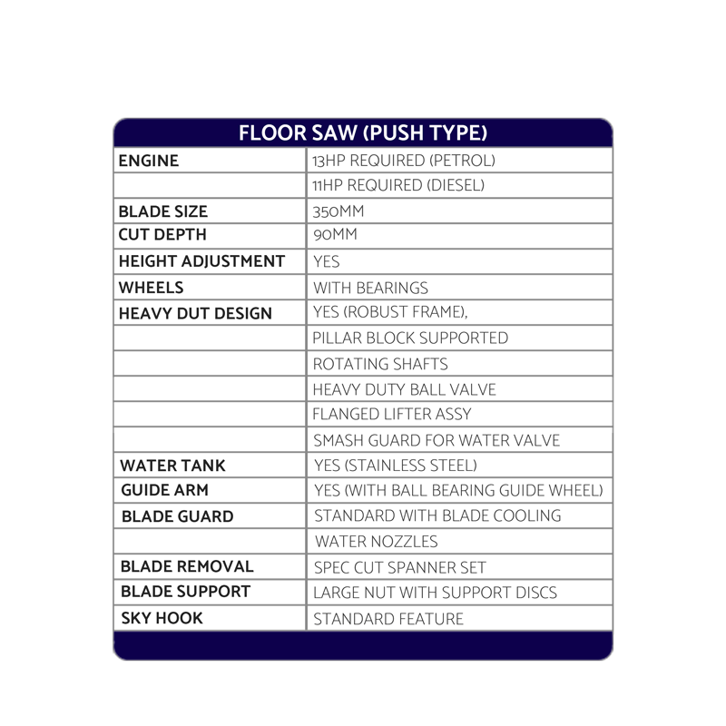 Optimal specifications for the power plant include a HP rating of between 11.0 to 18.0 horse power to run the standard floor saw.